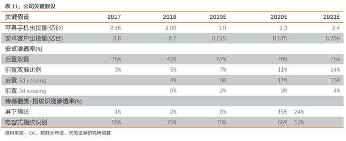 产业链位置不可替代,有望受益于未来屏下指纹市场增速提升。与电容式指纹识别相比,屏下指纹技术壁垒更高,目前仅有少数公司取得量产技术突破。未来,伴随屏下指纹产业需求释放,公司发挥技术卡位和产业链优势,有望开启指纹识别模组业务新一轮快速增长:
