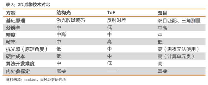 产品纵向升级之一:3D sensing。与普通摄像头相比,3D sensing可以获取拍摄对象的三维位置及尺寸信息,应用领域涵盖生物识别、三维建模、人机交互等,现有三种主流方案:结构光、ToF以及双目立体成像方案,其中结构光和ToF精度更高、功耗更低。具体看手机前后置3D摄像头技术方案: