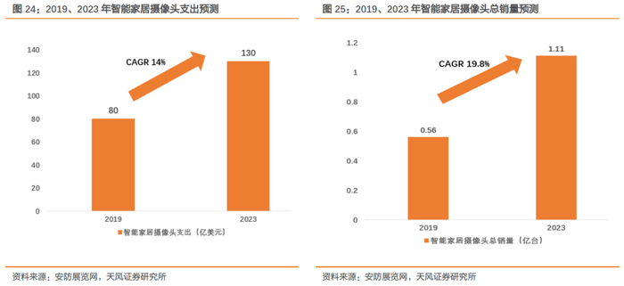产品横向扩展应用场景之一:IoT。5G加速落地,万物互联时代加速开启,IoT领域中最先兴起的智能家居市场对摄像头需求开始迅速增长,尤其是具有交互功能的智能电视。以华为荣耀智慧屏为例,荣耀智慧屏搭载的可升降AI摄像头分辨率为1080P(超市场主流分辨率),感光芯片尺寸1/2.7(超市场主流手机前置摄像头),单个像素达到2.24*2.24,使其具有有别于普通电视的三个功能:AI Kids、AI健身和视频通话,将引起智能电视浪潮,带动摄像头模组在IoT领域渗透加速。据Strategy Analytics数据,2019年全球消费者将在智能家居摄像头(包含可视门铃)上支出近80亿美元,并预计将以CAGR 14%的速度增长至2023年近130亿美元;在可视门铃的迅速普及下,2019年智能家居摄像头预计总销量突破5600万台,同时预计将以CAGR 19.8%的速度增长至2023年超1.11亿台。
