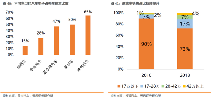 市场结构:高端化、电动化趋势促进汽车电子高占比的车型销量。目前国内自主低档车汽车电子成本占比7-15%,中高档车占比约为 28%-40%,消费升级带动高端车销售占比提升(17万车型占比从10年的10%提升到27%),判断汽车电子市场结构优化明显,进一步证明汽车电子市场规模增长有动力。