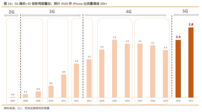 苹果2020年有望迎来“超级周期”,驱动公司业务增长。2020年苹果客户进入ID创新+5G通讯换代“超级周期”。从ID来看,07年iPhone诞生至今,ID周期从2年变为3年,具体看,17-19年机型为同ID系列产品,2020年苹果将进入新一轮ID迭代周期。此外,5G通讯迭代,苹果预计于秋季发布覆盖Sub-6G及毫米波频段的新机,同时,为完善4G产品布局,将于春季发布SE 2发力低端产品层级。整体来看,苹果5G通讯+ID创新周期叠加,预计2020年iPhone出货量达到2.3亿台,同比增速21%。展望未来,随着5G建设完善、服务及应用持续丰富,供给逻辑变为需求逻辑,出货量有望保持高增长。公司作为苹果前置、后置摄像头模组供应商,公司未来苹果相关业务增长动力充足。