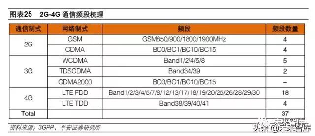通信技术从 2G 发展到 5G,手机射频前端最大的变化在于支持的频段增加。2G 时代,通信制式只 有 GSM 和 CDMA 两种,射频前端采用分立器件模式,手机支持的频段不超过 5 个;3G 时代,由 于手机需要向下兼容 2G 制式,多模的概念产生了,手机支持的频段最多可达 9 个;4G 时代的全网 通手机所能够支持的频段数量猛增到 37 个。