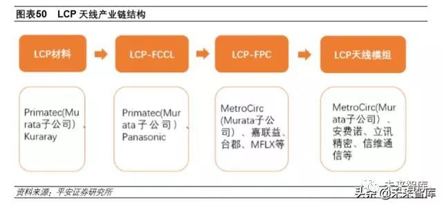 LCP天线分为材料、FCCL、FPC、SMT四道工艺,前道 LCP材料和 FCCL由 Murata子公司Primatec 提供,LCP-FPC 由子公司 MetroCirc 以及中国台湾 FPC 厂嘉联益提供,天线模组由立讯精密和安 费诺提供。LCP 天线代表了 5G 时代终端天线的发展方向之一,相较于传统天线,LCP 天线在加工 难度和价值量上有显著提升。