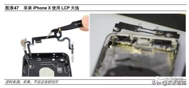 2017 年苹果 iPhone X 发售后,首次采用了多层 LCP 天线。iPhone X 中使用了 2 个 LCP 天线, iPhone 8/8Plus 亦使用1个局部基于LCP软板的天线模组。而在2018年最新的三款iPhone (iPhone XS/XS Max/XR)都配备了 LCP 天线。LCP 工艺复杂,成本高,大约单组 4~5 美元,iPhone X 两根合计 8-10 美元,而 iPhone 7 上所采用的 PI 天线 ASP 约为 0.4 美元,LCP 将单机天线价值提升 了约 20 倍。