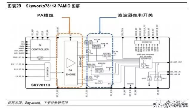 FEMiD 指把滤波器组、开关组和双工器通过 SIP 封装在一枚芯片中。FEMiD 最早出现在 3G 时代是 由于 3G 手机第一次有了多模多频段(MMMB)的需求,当时主导 FEMiD 市场的是以 Murata 和 TDK 为代表的无源器件厂商,它们把开关器件和多个频段的滤波器集成到一枚芯片当中打包出售,一方 面为手机厂商降低设计和采购难度,另一方面也能够为自身带来更高的利润。事实上从 3G 时代开 始,整个 RF 前端方案的进化都是围绕多模多频段进行的。从技术的角度看,FEMiD 的实现难度并 不高。当时的主流 PA 供应商诸如 Skyworks、Renesas、Avago(Broadcom)在自身缺乏无源器件 工艺的情况下无意涉足这样一个领域。