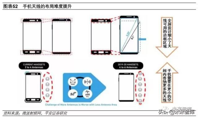 射频复杂性的提高使得天线数量有所增加,接近手机可达到的实际极限。从智能手机系统架构上也 可以看出,5G 需求更高的数据速率,需要更多的天线,以使用多种方式来提供,包括多频带载波聚 合、4x4LTE MIMO 与 Wi-Fi MIMO,天线的典型数量也将从 4G 手机的 4-6 根增加到 8-10 根,甚至 更多,但天线可用空间在缩小。