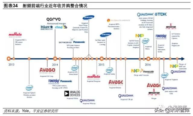 4G 商用后, 3G 时代无源器件厂商主导的 FEMiD 时代一去不返, 2011 年 Murata 通过收购 Renesas 的 PA 部门成为 PAMiD 供应商,2014 年 RFMD 与 TriQuint 合并成立了 Qorvo,2016 年 Skyworks 收购了松下的合资公司获得了高性能滤波器技术。射频行业并购整合的原因主要有:一、高通“五 模十频”基带的推出让智能手机进入了全网通时代,从而促进了多频段射频的需求;二、智能手机 的轻薄化趋势压缩了PCB板面积,传统低集成度的设计方案对于捉襟见肘PCB空间来说太过奢侈。