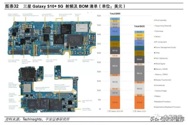 通过对三星 Galaxy S10+ 5G(Sub 6G)和 4G 版的拆机对比,物料清单(BOM)中,射频前端价 值从 4G 版的 31 美金上升到 46 美金,价格上升幅度接近 50%,射频前端 BOM 占比从 4G 版本的 7%提高到了 9%。对早期 5G 智能手机而言,射频前端是推动 5G 手机价格上涨的主要原因。