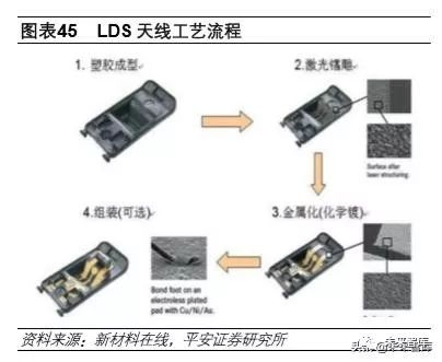 另外,LDS 应用领域广泛,除了数码产品厂商外,还包括无线充电、NFC 设备、精密医疗设备、汽 车电子等。采用玻璃后盖的三星 S8 中同时使用了 LDS 和 FPC 天线,NFC 天线和 WPC 充电线圈 为 FPC 工艺,其余天线为 LDS 工艺。