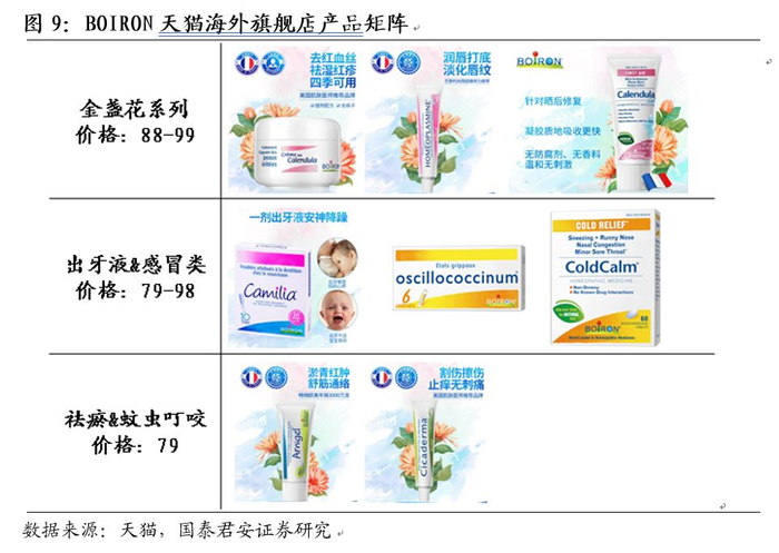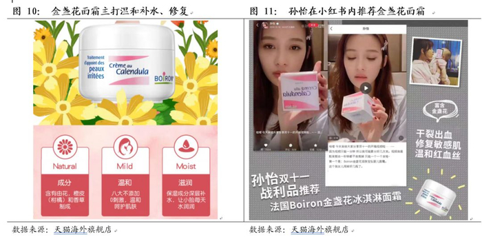 Boiron是法国国民品牌,初入中国主打母婴市场、发展势头喜人。Boiron是一家法国制药集团,由两名药剂师Jean和Henri Boiron于1932年成立,也是法国的上市公司,公司的产品销往全球59个国家和地区。宝弘集团2018年销售额6.04亿欧元,其中大中华地区收入为517.5万欧元,Bioron于2018年由香港可诗(现为珀莱雅全资子公司)代理进入中国市场,并于2018年8月正式入驻天猫国际,并获得当年天猫国际新上架母婴洗护类目第一名,全渠道销售业绩增长150%+。BOIRON海外旗舰店现有金盏花修护面霜、金盏花润唇膏、蚊虫叮咬止痒膏等明星产品,产品定价普遍在80-100元/件,是最符合当前母婴产品消费升级需求的、天然安全的功能性护肤品。以明星单品为金盏花宝宝面霜为例,其成分天然温和、主打滋润修复功效,婴儿和成人均可使用,具备保湿滋润、改善敏感肤质、用作婴儿面霜除湿疹等多种功能。明星妈妈孙怡曾在小红书APP里推荐过,2019年11月金盏花面霜在天猫海外旗舰店月销量突破1.5万件,已经达到爆款产品的标准。随着宝弘天猫旗舰店的产品线不断丰富,未来品牌成长性值得期待。