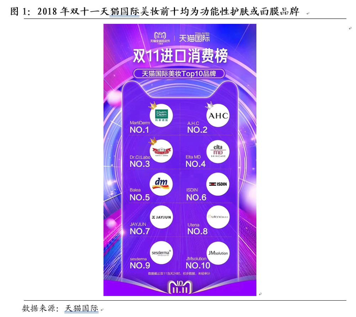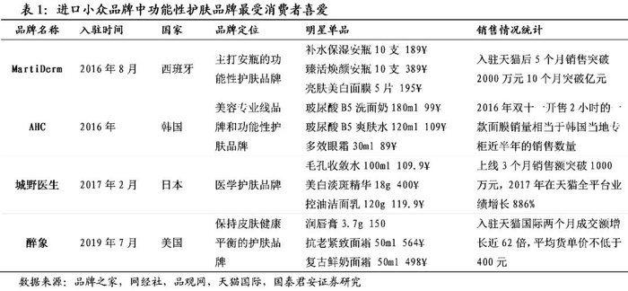 进口小众品牌中,功能性护肤品牌和面膜品牌最受欢迎。从这些小众品牌的特点来看,2018年双十一天猫国际美妆销售排名前十的品牌为:玛蒂德肤、AHC、城野医生、艾尔特梦迪、芭乐雅、怡思丁、JAYJUN、佑天兰、sesderma、肌司研,全部为功能性护肤品牌或面膜品牌,其中排名前三的全都是功能性护肤品牌。尽管品牌价格定位各不相同,但主打的卖点无一不是在传达专业护肤的理念,包括安瓶高浓度护肤、美容院线护肤品或者皮肤健康护理等理念。根据网经社报道,2019年618期间天猫国际海外品牌整体成交额同比增长197%,来自北欧、东南亚以及美洲的“小众国家”正在成为驱动销售增长的新势力,同比增速远超传统出口大国美国、日本、韩国、澳大利亚等。