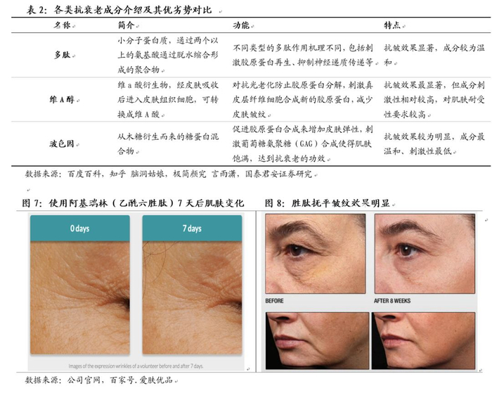 A醇、胜肽和玻色因是高端护肤品中常见的三大抗衰老成分,胜肽的综合优势较为明显。A醇、胜肽和玻色因并列三大最常运用于大牌护肤品的抗衰老成分,其中A醇抗皱效果最明显,但是刺激性也相对较高,对皮肤耐受性有较高要求;玻色因(欧莱雅集团独家专利成分)是三者中最温和、刺激性最低的成分,而且玻色因修复皮肤的功效明显,但是同等浓度下玻色因的抗皱效果不如A醇和胜肽明显;胜肽的种类繁多,其本质是小分子蛋白质,由两个以上的氨基酸组成,其抗皱效果明显、成分属性温和,因此在高端化妆品中得到广泛运用。