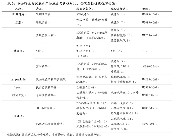 胜肽种类繁多,圣瑰兰源自西班牙胜肽家族,以乙酰基六肽-3闻名全球,抗衰老护肤品性价比优势极为明显。珀莱雅此次合作的西班牙品牌圣瑰兰,其创始人Jose博士旗下拥有全球著名的生物科技实验室LipoTrue(与Lipotec同源),该实验室专注于通过核心技术平台获取先进的活性成分,曾开发了大名鼎鼎的乙酰基六肽-3(类肉毒杆菌素,被称为可以涂抹的肉毒素),六胜肽主要通过局部阻断神经递质减弱肌肉收缩,使得脸部肌肉放松,从而达到抚平皱纹的效果,Lipotec公司注册了乙酰基六肽-3的国际专利,因此也是众多国际大牌的六胜肽原料供应商。我们对比了添加玻色因、胜肽和A醇的顶级品牌及高端品牌活性成分含量及产品定价,活性成分含量较高(30%)、排名较前(前5以内)的产品定价最低为1760元/48ml,最高为4200元/50ml。圣瑰兰明星产品中胜肽成分含量在10%-20%之间,产品售价仅400-500元/30ml,同类品牌修丽可旗下活性成分含量达10%的紫米精华售价为其2倍多。