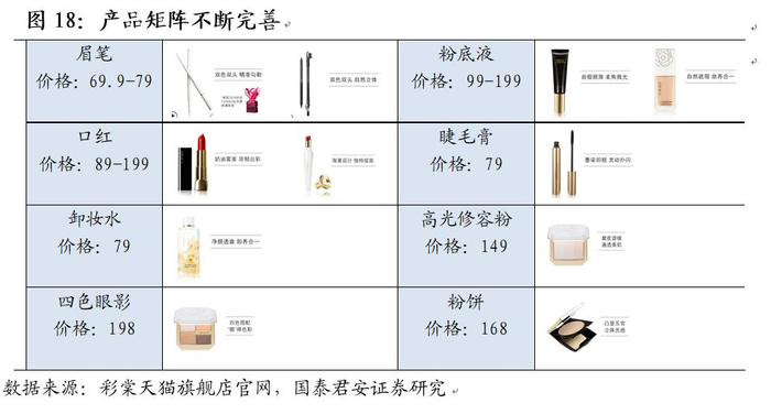 深谙东方之美,产品矩阵不断完善。彩棠主张“东方美学”,走国风路线,产品风格和宣传图片偏好中国风,整体风格偏淡雅写意。其产品力求展现中国女性魅力,是专门研发的适合中国女性使用的彩妆产品,例如其粉底液色号和眉笔色号都是专门为亚洲女性打造的色号。从一只爆款眉笔起步,到如今彩棠已经构建了较为完善的产品矩阵,覆盖口红、粉底液、眼影、高光等多个品类。从品牌定位和定价来看,彩棠属于国内中高端彩妆品牌,主力产品定价在70-200元之间。彩棠已经打造了明星单品双色双效眉笔,天猫旗舰店累计销量达32.5万件,荣获2019时尚COSMO社交媒体爆款奖。