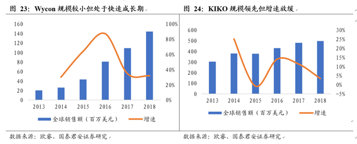 对标可比品牌KIKO,Wycon发展空间无限。KIKO MILANO于1997年成立于意大利,定位专业彩妆品牌,产品种类齐全,单品定价在100元左右。Wycon与KIKO产品定位和品牌风格相似,但Wycon成立时间为2009年。KIKO品牌目前已进入相对成熟的发展阶段,全球终端零售额约35亿元,2018年同比增长3.4%;相比之下,Wycon品牌正处于成长期,2018年全球终端零售额约10亿元,同比增长31.8%,对标KIKO,Wycon仍有极大成长空间。