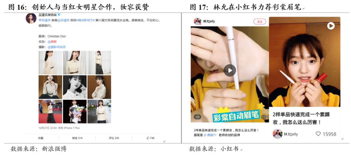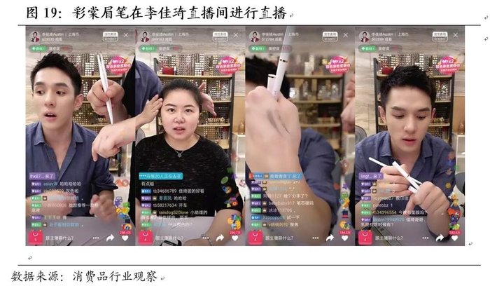 牵手仲文电商,拥抱社交营销。彩棠以电商为主要销售渠道,在珀莱雅增资入股后,借助珀莱雅的生态体系,开始积极进行营销推广,并从视觉页面优化、消费者互动体验等多方面扩大品牌影响力、提升业绩表现。彩棠现已在小红书投放了上万篇种草贴,并与头部KOL李佳琦开展合作,增加品牌曝光度,在短时间内提升销量。据消费品行业观察报道,彩棠与李佳琦在2019年5月和6月进行了两次直播合作,观看人数分别达120万和60万人次,共计销售3.3万和3.6万支眉笔。通过积极拥抱社交营销,彩棠获客能力和销售转化得到明显提升。