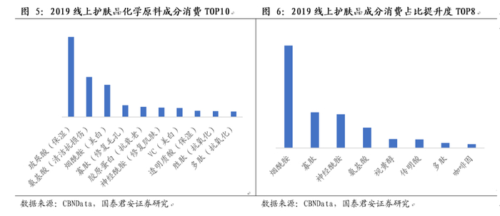 “成分党”逐渐兴起,保湿、美白、修复和抗衰老最受关注。功能性护肤品的兴起和自媒体的普及为各路达人、专家创造了分享化妆品知识的有效途径,消费者逐渐变得成熟、理性,对化妆品成分和额功效性的关注度与日俱增,由此诞生了一批被称为“成分党”的消费群体。以三亩和大嘴博士为代表的“成分党”KOL也获得了极高的人气和影响力。根据CBNData《2019线上美妆个护人群洞察报告》,玻尿酸、氨基酸和烟酰胺是当前成分党线上消费最偏爱的三大成分;烟酰胺、寡肽和神经酰胺的消费占比提升最快。从消费者最关注的前十大成分来看,当前成分党们最主要的需求为保湿、美白、修复和抗衰老。