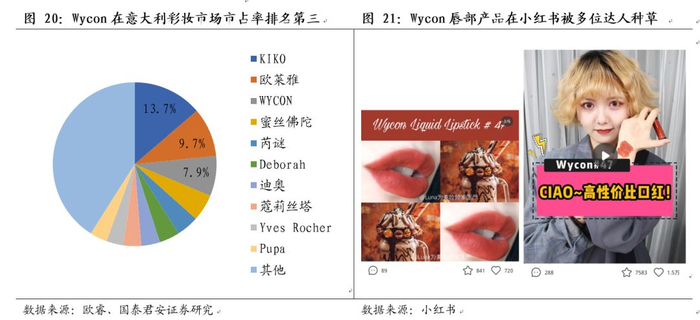 Wycon是意大利排名前三的国民彩妆品牌,近年来持续快速成长。Wycon品牌创立于2009年,是意大利本土的国民彩妆品牌,在法国、西班牙、葡萄牙、希腊及比利时等国家拥有240多家门店,根据欧睿统计2018年Wycon全球销售额突破10亿元,最近三年CAGR高达49%,Wycon在意大利本土彩妆市场的市占率高达7.9%,仅次于KIKO和欧莱雅,作为专业彩妆品牌其产品线极其丰富,SKU多达3000多个。2019年10月底,上海仲文作为唯一官方运营商为Wycon开设了天猫国际海外旗舰店,目前仅上线14款产品、42个SKU,考虑到Wycon自身丰富的产品线,未来在产品引进方面还有很大的发展空间。