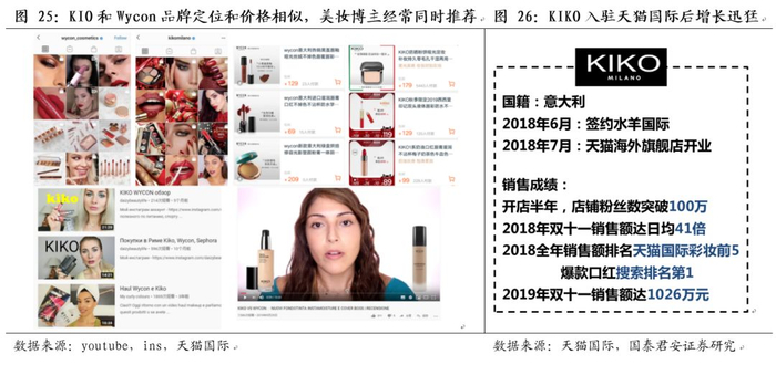 Wycon进入中国市场较晚,天猫海外旗舰店增长潜力巨大。KIKO于2018年5月进驻天猫国际,入驻不到半年,就取得了2018年天猫国际彩妆品牌销售额前五,爆款口红品牌搜索第一的好成绩。2019年618 KIKO明星单品4系小黑管口红开卖30分即成交10000件,截止2019年12月KIKO海外旗舰店已拥有184.8万粉丝,,多款产品月销超过5000件。Wycon于2019年10月底开设天猫国际海外旗舰店,参考KIKO的发展历程,未来Wycon天猫海外旗舰店增长潜力巨大。