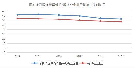 此外,股权集中度指标表征了公司治理中的“一股独大”现象,图6显示A股实业企业和净利润连续增长的A股实业企业大股东持股比例都在逐年减少,其中净利润连续增长的A股实业企业的股权集中度与A股实业企业之间的差距收窄,说明净利润连续增长的A股实业企业在解决一股独大问题、有效开展高速治理行为方面有着更强动力。反过来也说明,“一股独大”问题的有效解决、公司治理水平的切实提升有助于提升企业的增长效率。