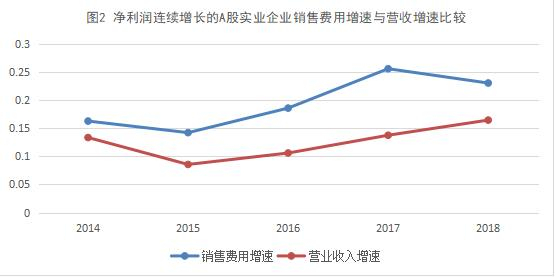 销售是推动企业利润增长的手段。如图2所示,净利润连续增长的A股实业企业销售费用扩张速度明显高于企业营收的增长速度。从图中可知,在2014年~2018年这5年间,销售费用的增幅在2015年和2018年出现了下降,这与前述经济增长出现的两次跌落期基本吻合。此外的年份里,特别是2015-2017年连续三年的增长,则意味着净利润连续增长的A股实业企业在销售投入方面采取了扩张的激进态度。