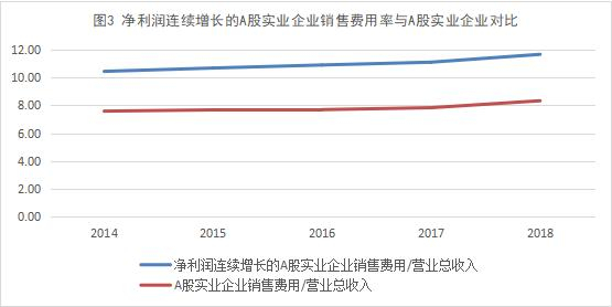 图3显示,净利润连续增长的A股实业企业销售费用率明显整体高于A股实业企业的平均水平。这意味着中国实业企业在品牌扩张的意识方面有所提升,即在品牌方面更舍得投入的企业整体增长情况更好。
