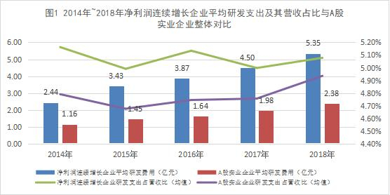 创新是驱动企业发展的重要因素。结合前文的分析从A股实业企业来看,如图1所示,2014年~2018年,净利润连续增长的A股实业企业平均研发支出每年均高于A股实业企业整体,且研发支出占营收比均值均高于A股实业企业整体。研发支出很大程度上反映了企业技术投入和创新能力。因此,这也在一定程度上可以看出,技术创新是驱动企业利润增长的要素之一。
