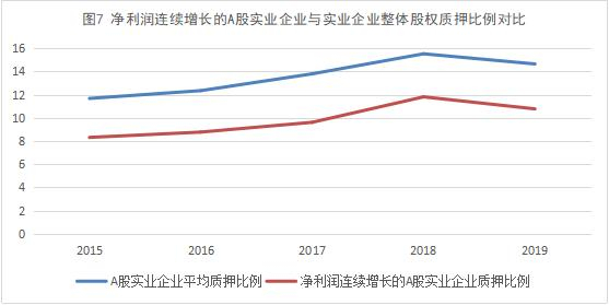 从质押率角度来看,图7反映了A股实业企业与净利润连续增长的A股实业企业股权质押比例的增长情况。2015年~2018年,企业的质押比例逐年增长,直到2019年有一个明显的回落。但是能够看到,净利润连续增长的A股实业企业整体质押率明显低于A股企业的平均水平。所以反过来说,净利润连续增长的A股实业企业质押率总体可控,这也正是企业进行风险管控的基本内容,包括做好现金管控,要有足够的现金储备来抵抗经济增长的趋缓。