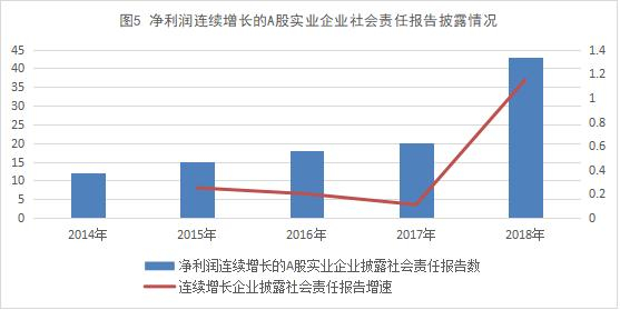 图5显示了披露社会责任报告的净利润连续增长的A股实业企业数量,从2015年至2017年披露数量逐年增多,但增长速度却逐年递减,然而在2018年披露数量突然出现了跃升,比2017年同比增长115%。这一定程度上受2018年6月中国A股正式被纳入MSCI指数影响,即意味着所有被纳入指数的A股上市公司必须接受ESG评级,所以ESG报告数量增长比较明显。