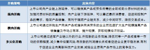 从并购的目的和并购策略来看,可以将并购分为三种,即纵向并购、横向并购和多元化并购。如下表所示,每种并购策略的目的不一样,导致其采取的并购措施也不一样,不论哪一种,都可以迅速提升企业的收入和盈利规模。此外,从操作层面还可以将并购分为借壳、整体上市和产业并购三类。