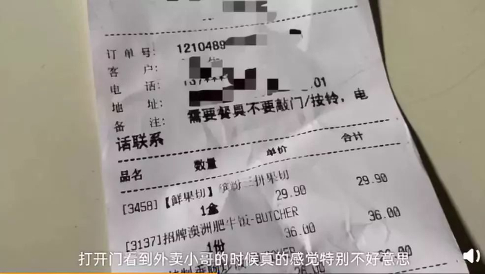 外卖小哥说,一直没有人接电话,想着人家可能有什么特殊情况,且有备注,就没有按门铃。那地方刚好在电梯口,人比较多,挂在门上怕被拿走,就一直等在门口打电话。虽然耽误了送单,但他觉得送一单就要对一单负责到底。