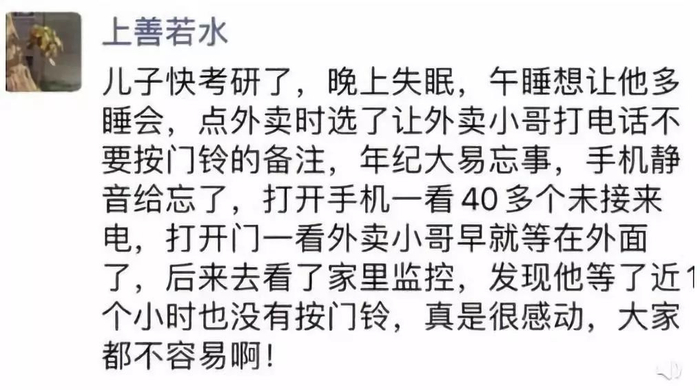 顾客说,最近家里小孩考研,压力蛮大的,睡觉经常睡不好,中午午睡的时候想让他多睡一会,所以点外卖的时候就选了打电话不要按门铃。