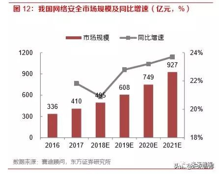 态势感知市场规模增长迅速,快于同期网络安全整体市场增速。根据赛迪顾问《中国网络安全发展 白皮书(2019)》报告,2018 年,我国网络信息安全行业的市场规模达到了 495.2 亿元,同比增 长 20.9%,预计 2021 年市场规模超过 900 亿元。而根据安全牛的数据统计,2017 年国内态势感 知(定义为围绕安全运营中心(SOC),并基于日志管理(SIEM)、大数据平台、威胁情报、关联分析、 沙箱等等关键技术和多维度数据,为用户提供预测、保护、检测和响应闭环能力的安全系统)的市 场规模约为 20 亿元,预计 2020 年达到 50 亿元,CAGR 约为 35.7%,显著高于 2017-2019 年网 络安全整体市场22.3%的复合增速,预计态势感知占整体安全市场的渗透率将从4.9%增长到6.7%。当前我们已经逐步迈进主动防御时代,随着等保 2.0 等政策的落地实施,整体网络安全市场将继续 保持较高增速市场。态势感知作为主动防御体系的安全大脑,对于监管单位和关键信息基础设施相 关的行业而言已成为必建设施,由于目前态势感知的市场渗透率较低,同时存量的态势感知需要 不断扩容和更新以适应外部网络环境及内部客户需求的变化,因此我们认为态势感知市场规模有 望继续保持高速增长趋势。