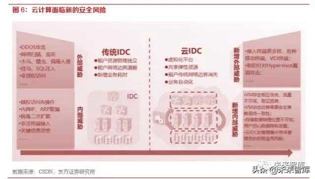 新兴技术的落地应用使得传统网络安全边界消失,并带来新的安全风险。云计算、大数据、物联网 等产业的快速发展催生出云安全、大数据安全等新兴安全领域,防护对象已由传统的 PC、服务器 拓展至云平台、大数据和泛终端。以云计算为例,云计算使得 IT 基础架构发生根本性变化,企业将其业务迁移到云端,租户传统网络边界消失,IT 基础资源集中在云端,因此遭受攻击后的影响和 破坏性更大。相较于传统的 IT 架构,云计算还面临虚拟化安全、数据集中等新的安全问题。