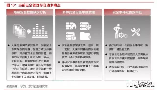 态势感知的建设与基础安全产品销售具有良好的协同作用。当前安全防御体系的建设已由“单一防 护”及“补丁”模式发展到“系统规划、整体协防”模式,态势感知平台仅定位于“安全大脑”, 完整的防护能力还需要布置众多的基础安全产品。当前态势感知市场的优势厂商一般都拥有各类 基础的安全产品,如防火墙、安全网关等,但这些传统安全产品往往同质化严重,为公司贡献的营 收增量有限。态势感知领域的优势厂商可以通过态势感知的建设带动传统基础安全产品的销售,收 入增长中枢有望实现进一步上移。