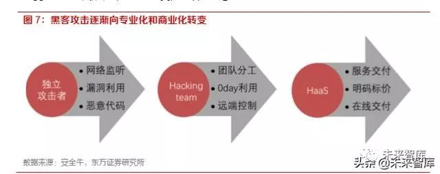 黑客攻击逐渐向专业化和商业化转变。DT 时代企业的核心业务越发依托信息系统,数据已成为企 业的核心资产,引来黑客等恶意攻击者的觊觎,导致近年来数据泄露、敲诈勒索病毒等安全事件层 出不穷。早期以极客为核心的黑客逐渐向组织化及专业化发展,攻击技术和手段更加高明,形成了 以利益驱动的庞大黑客产业。黑客的“盈利方式”也变得多样,如售卖敏感信息直接变现、通过 DDos 攻击实现敲诈勒索或通过篡改信息改变资产所有权等,甚至提供 HaaS(攻击即服务)形式 的服务,攻击者只需在线提交需求和付款,就能获得相应的云端攻击服务。这使得攻击者采取更加 隐蔽的手段收集、窃取或者篡改信息,这要求企业或组织在发展新技术的同时需要快速辨别不利于 自身安全的潜在威胁,保护自身免受网络攻击的危害。
