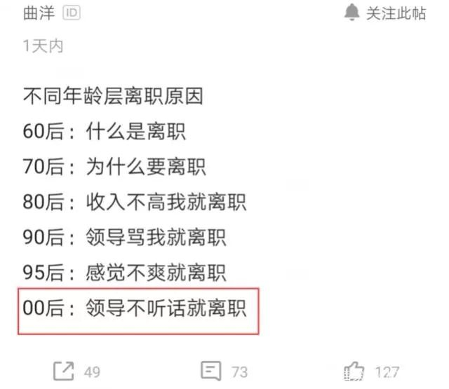网上有一段形容职场态度的段子是:“60后”和“70后”不知道什么叫离职,“80后”只要遇到更好的平台就离职,“90后”只要领导一批评就离职,“00后”觉得只要领导不听话就离职。