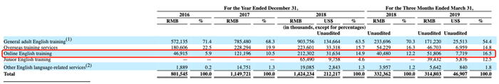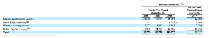 2018年全年,参加成人英语培训的学生5.6万,青少儿学生8746名,出国考试培训学生8885名;在线部分4.46万,总学生11.8万。