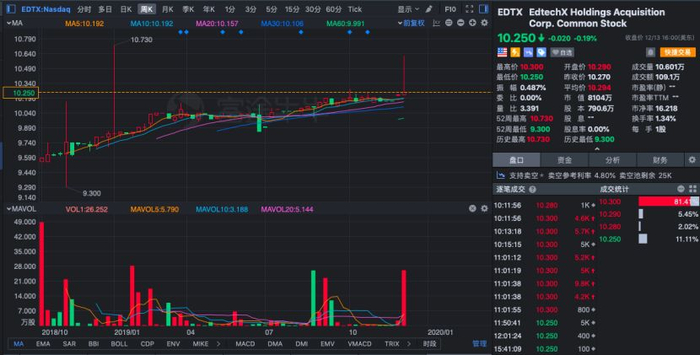 此次美联英语将装入的“壳”是EdtechX Holdings(EDTX:NASDAQ),该公司于2018年10月在纳斯达克上市,总部位于英国伦敦。上市以来的涨幅仅为7.33%,目前股价10.25美元,市值更是只有8103.91万美元,不到1亿美元。相比此次交易的美联英语5.35亿美元估值(相比IPO前的估值折价八成),差距很大。