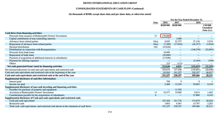 相反,2016年美联英语获得过一次1.7亿元的融资,在筹资活动现金流量一览中,是有体现的。