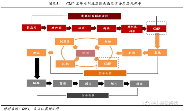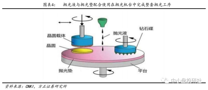 化学机械抛光Chemical Mechanical Polishing,简称CMP,是集成电路制造过程中实现晶圆表面均匀平坦化的关键工艺。与传统纯机械或化学的抛光方法不同,CMP是通过化学作用和机械研磨的组合技术来实现晶圆表面微米/纳米级不同材料的去除,从而达到晶圆表面的高度(纳米级)平坦化效应,且避免了由单纯机械抛光造成的表面损伤,使下一步的光刻工艺得以进行。CMP的主要工作原理是在一定压力及抛光液的存在下,被抛光的晶圆对抛光垫做相对运动,借助纳米磨料和机械研磨作用与各类化学试剂的化学作用之间的高度有机结合,使被抛光的晶圆表面达到高度平坦化,低表面粗糙度和低缺陷的要求。即公司生产的抛光液需配合抛光垫在抛光机台中完成整套抛光工序。抛光液的主要作用是为抛光对象提供研磨及腐蚀溶解,通常影响化学机械抛光中的“化学”因素。而抛光垫的主要作用是带动抛光液运动,传导压力和打磨发生化学反应的材料表面,通常影响化学机械抛光的“机械”因素。根据不同工艺制程和技术节点的要求,每一片晶圆在生产过程中都会经历几道甚至几十道的CMP抛光工序。