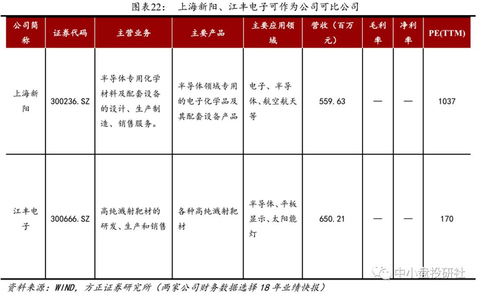 由于半导体材料产业细分子行业众多,A股市场中暂无与公司同一层面的直接可比公司。考虑到公司在国内CMP抛光液领域处于龙头地位,因此选择半导体材料产业中国内两家第一梯队公司上海新阳、江丰电子作为公司可比公司,但具体产品差异较大。