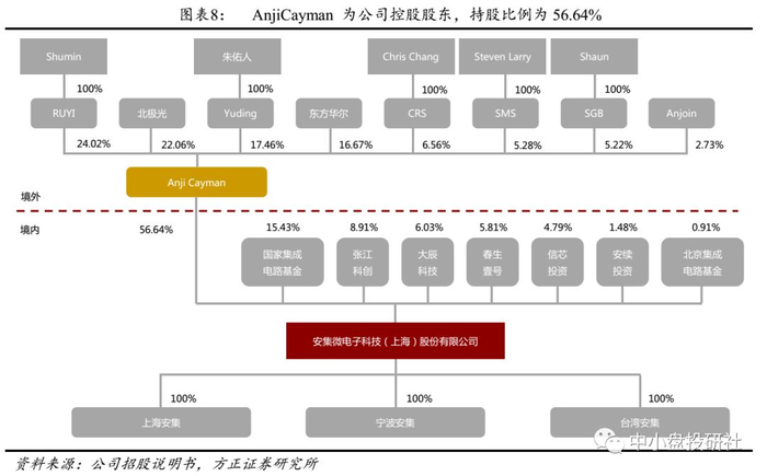 AnjiCayman目前为安集科技控股股东。AnjiCayman 为一家投资控股型公司,通过安集有限和上海安集开展研发和生产经营。AnjiCayman 股东 RUYI、CRS、SGB、SMS 分别为AnjiCayman创始人ShumlnWang、ChrisChangYu、ShaunXiao-FengGong、Steven LarryUngar 100% 持股的公司;Yuding、Goldyield为2004年至2005年期间开始投资的早期投资者持股的公司;北极光、东方华尔、ZhangjiangAJ、春生壹号、信芯投资为2010年至2014年期间投资AnjiCayman 的投资者。信芯投资、张江科创(张江科创间接持有ZhangjiangAJ100%的股权)、春生壹号及大辰科技(Goldyield出资人在中国境内控制的公司)共同对安集有限增资。