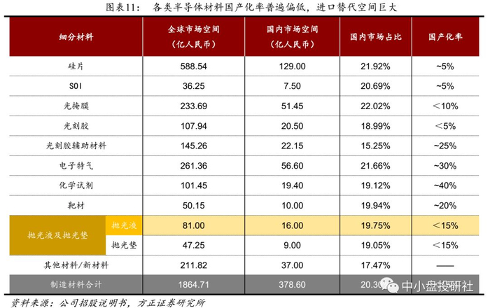 半导体材料技术壁垒高,全球市场被海外企业寡头垄断,国内市场国产化程度较低且主要用于中低端领域。半导体材料行业具有极高的技术壁垒,目前主要半导体材料由日本、欧美、韩国等少数跨国企业垄断,且多数为综合性的化工巨头,半导体材料业仅为非常细分业务领域之一。受制于长期研发投入不足、人才短缺、技术积累等因素限制,我国半导体材料产业与国际企业差距巨大,主要依赖进口。根据中国石油和化学工业协会估算,目前本土产线上国产材料使用率不足15%(考虑外资企业在中国大陆地区设厂经营)。在高端制程和先进封测领域国产化率则更低(不足5%),高端光刻胶、300mm大硅片基本全部依赖进口。就抛光材料而论,目前抛光液及抛光垫的国产化率均低于15%,进口替代空间巨大。