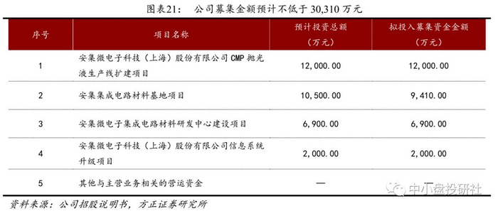 公司拟发行不低于13,277,095股,募集资金预计不低于30,310万元。其中 1.2亿元用于CMP抛光液生产线项目扩建,9410万元用于安集集成电路材料项目基地,6900万元用于研发中心建设项目,2000万用于信息系统升级项目。发行后总股本53,108,380股。