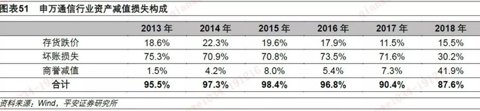 2018年,受运营商资本开支的下降、4G投资周期进入尾声、5G投资周期尚未开始以及中兴受到制裁等多方面因素的影响,不少通信行业公司并购的标的经营业绩出现大幅波动,未达到承诺业绩或者出现大幅下降,特别是那些业务与母公司没有明显协同效应的标的。因此,通信行业整体的商誉减值规模大幅上升,在资产减值中的占比达到了41.9%。