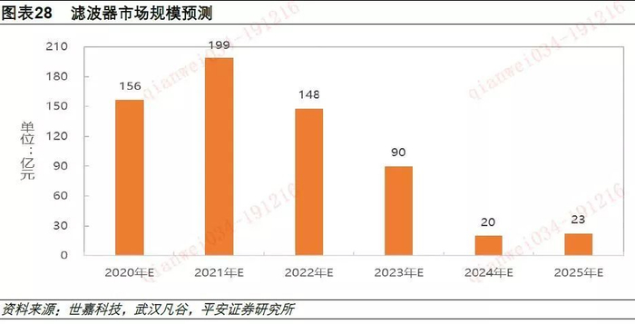每年滤波器市场规模=每年5G室外基站建设量*3*96*滤波器单价。按照这个公式测算:2020年-2025年,滤波器市场总规模约659亿元,2020年约156亿元,2021年达到顶峰,约199亿元。