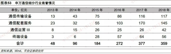 截止2018年底,通信行业整体商誉规模约359亿元,仍处于高位,商誉减值风险没有完全释放。特别是通信传输设备以及通信配套服务两个细分行业商誉规模高达100亿元以上。