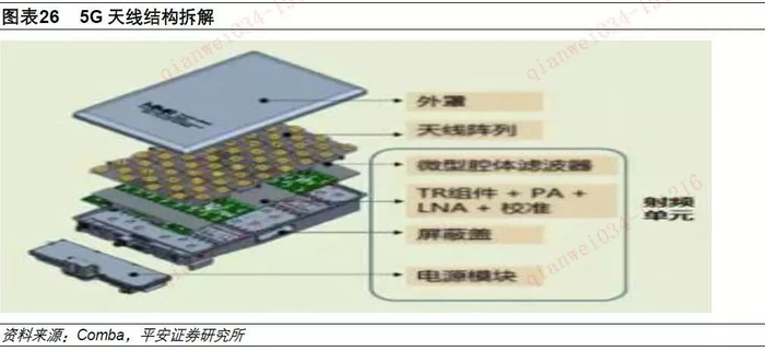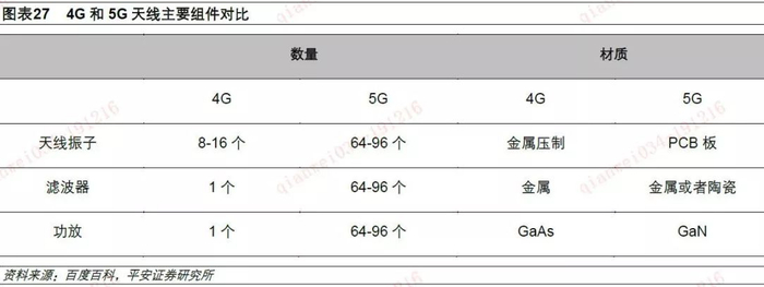 Massive MIMO天线:使用大规模阵列天线形成多收多发的系统,增强基站同时接受和发送多路不同信号的能力,提高了频谱利用率以及数据传输的稳定性和可靠性。天线物理构成:5G天线由外罩、天线阵列、微型腔体滤波器、TR组件+PA+LNA+校准、屏蔽盖以及电源模块构成;除外罩和天线阵列外的统称为射频单元。4G和5G系统中,天线组件中的天线振子、滤波器和功放主要区别体现在数量和材质方面。天线振子:4G时代的数量大约为8-16个,5G时代约64-96个;4G时代的材质主要是金属压制件,5G时代的材质是PCB板。滤波器:4G时代的数量大约为1个,5G时代约64-96个;4G时代的材质主要是金属,5G时代的材质是金属或者陶瓷。功放:4G时代的数量大约为1个,5G时代约64-96个;4G时代的材质主要是GaAS,5G时代的材质是GaN。