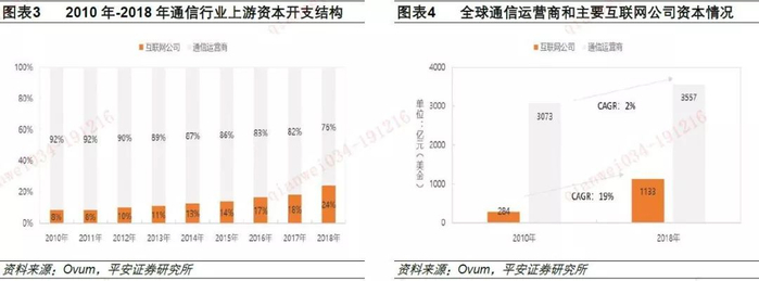 根据市场研究机构Ovum发布的研究数据显示:互联网公司和通信运营商的资本开支总体规模在2018年达到了约4690亿美金,同比2010年的3357亿美金,增加了1333亿美金,2010年到2018年的年均复合增速约4.2%。